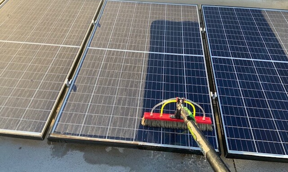 Materiais profissionais, escovas e rodos adequados para placas solares e água desmineralizada quando necessário. Nada de produtos agressivos.